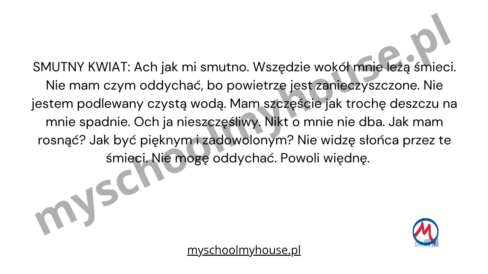 Z czasem dzieci zauważają problem i postanawiają pomóc – sprzątają, segregują śmieci i dbają o rośliny. Dzięki ich działaniom smutny kwiat odzyskuje siły, a Ziemia znów staje się radosnym miejscem dla wszystkich.